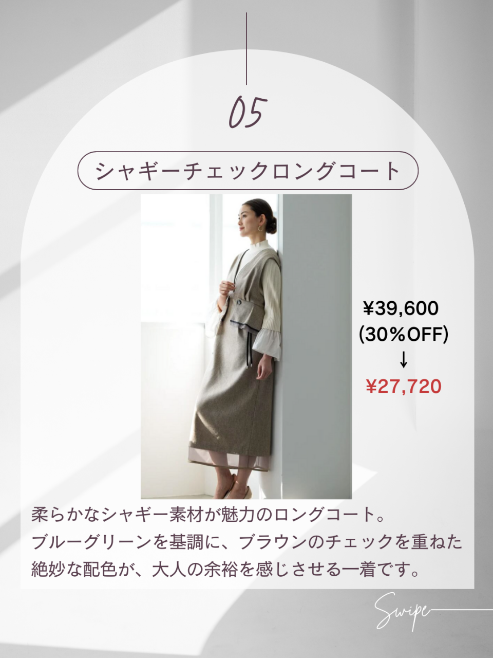 柔らかなシャギー素材が魅力のロングコート。ブルーグリーンを基調に、ブラウンのチェックを重ねた絶妙な配色が、大人の余裕を感じさせる一着です。