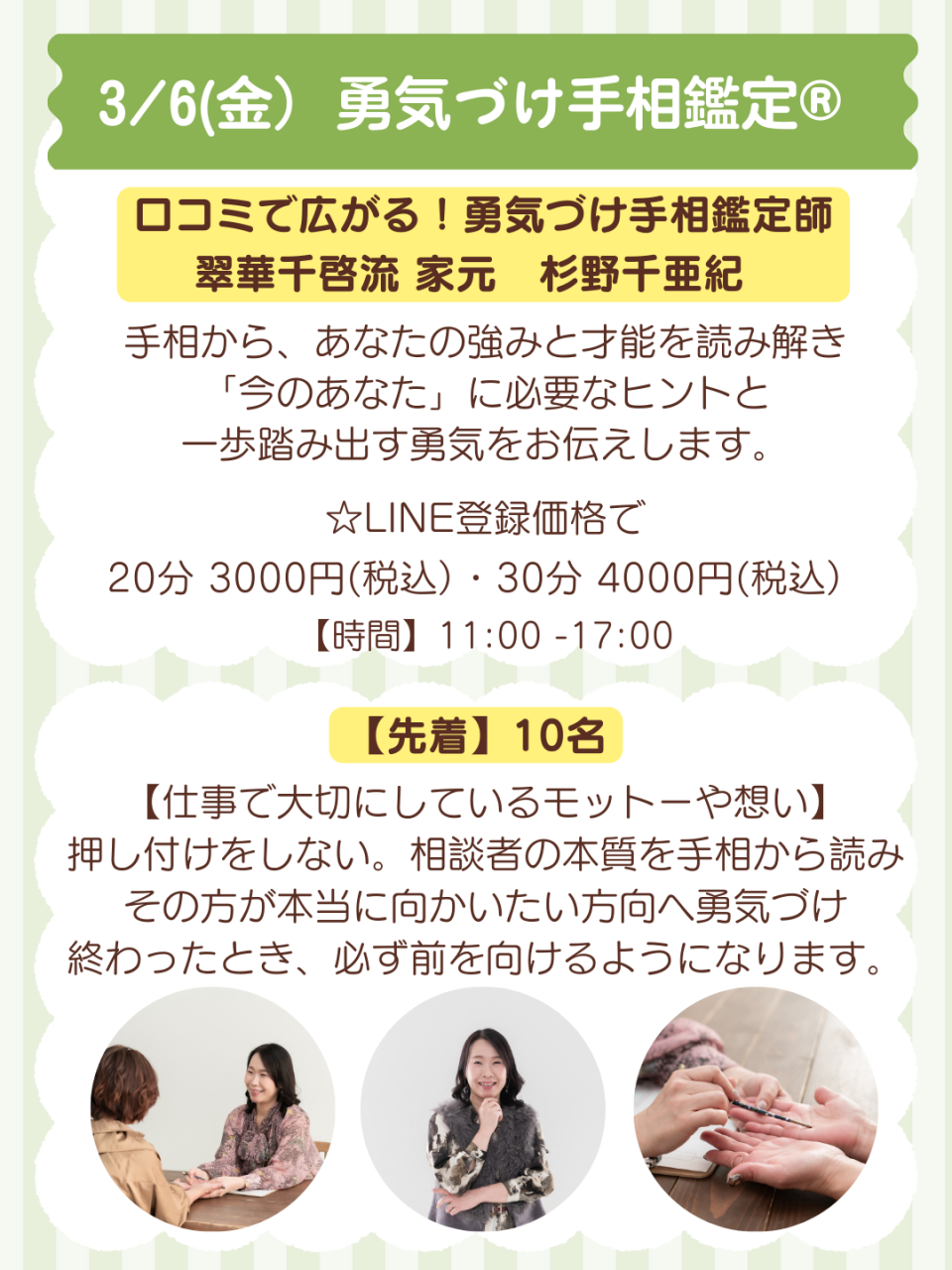 押し付けをしない。相談者の本質を手相から読み、その方が本当に向かいたい方向へ勇気づけをする。終わったとき、必ず前を向けるようになる。